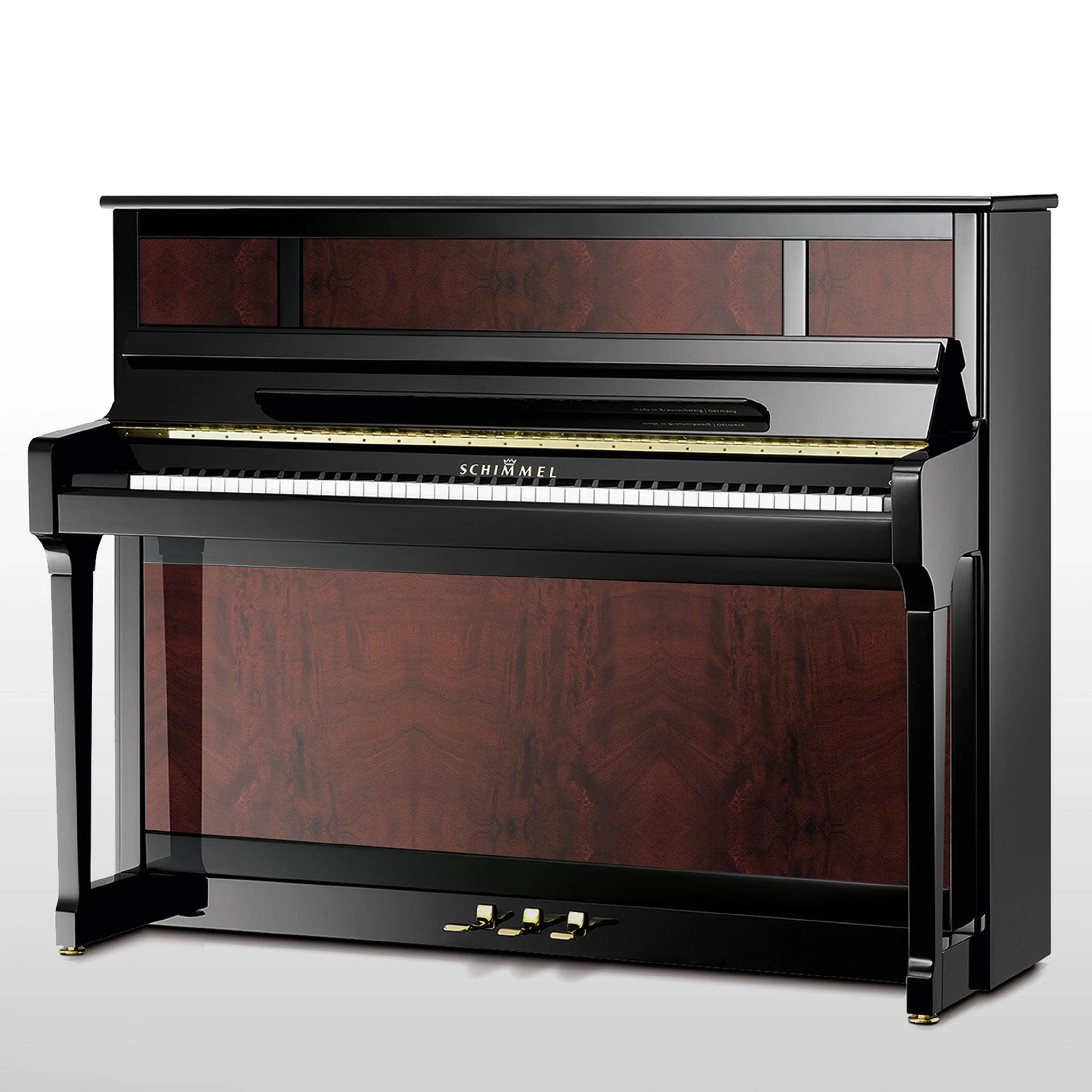 Even the cabinet design of this Schimmel Classic C121 Prestige Upright Piano seems inspired by the pianos of yesteryear; of saloons and grand halls and galleries. Crafted from Burled Walnut, Bubinga, or Flame Khaya with ebony polish, it's a high-quality instrument to be treasured.